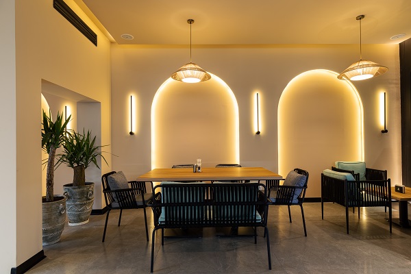 • انتخاب نور ملایم و گرم برای ایجاد حس آرامش و تشویق به گفتگو.
